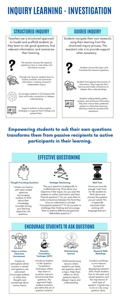 The essence of inquiry-based learning lies in the art of questioning, where both teachers and students play critical roles. By mastering the skill of asking the right questions and fostering an environment where students are encouraged to inquire and explore, we support students in developing deeper understandings and becoming lifelong learners.
