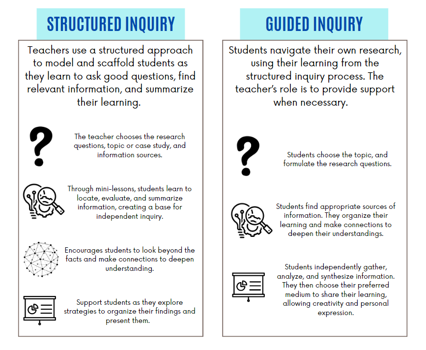 Structured inquiry involves the teacher leading the class through a common topic with well thought-out questions and resources. Guided inquiry, in contrast, offers students more autonomy. They choose their topics and apply their knowledge, skills, and understanding with the teacher providing the necessary guidance and support.