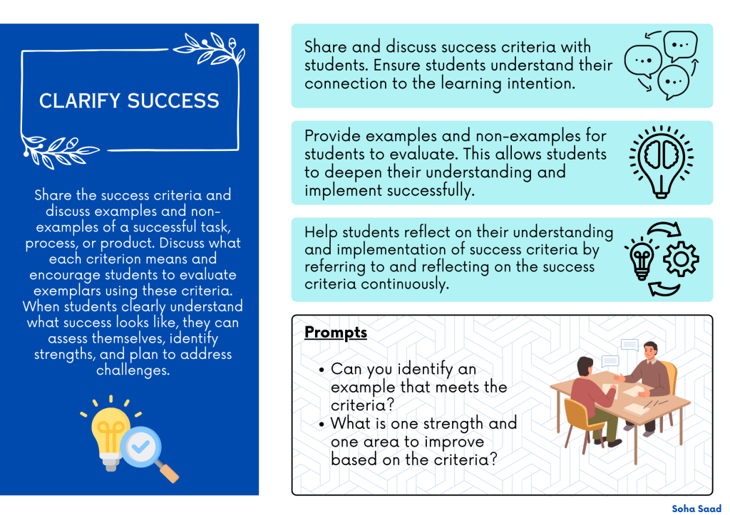 Clarify Success: Ensure that students understand what success look like, you can share the success criteria and view examples and non examples of a successful task, process or product. Discuss what each criterion means and encourage them to evaluate exemplars using these criteria. When students have a clear understanding of what success looks like, they can assess themselves, identify strengths, and plan to address challenges.