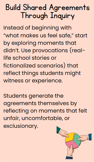 This process builds agency from the very beginning. Students see that their voices matter, not just in tasks, but in shaping the emotional and social classroom environment. It also models how conceptual learning works: we move from specific experiences to broader, transferable ideas.