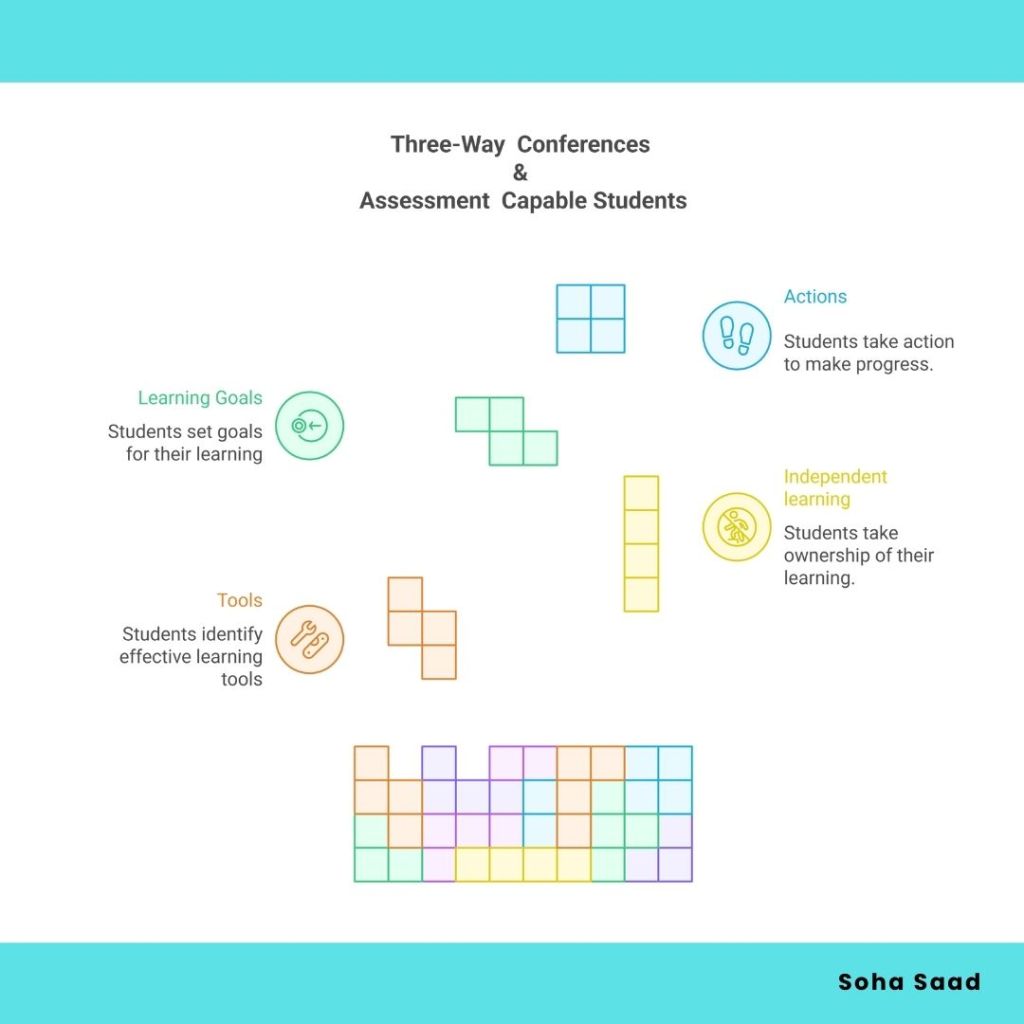 This whole process develops assessment-capable students. This kind of reflection should not be limited to the three-way conference. It needs to happen periodically so students keep building awareness of how they learn and where they are heading. They know what helps them move forward, and they can name the tool, not just the task. They can identify the type of support they need before checking with the teacher, which is the foundation of independent learning.